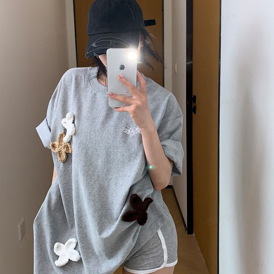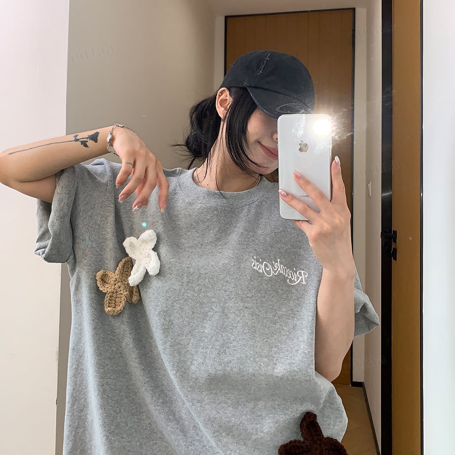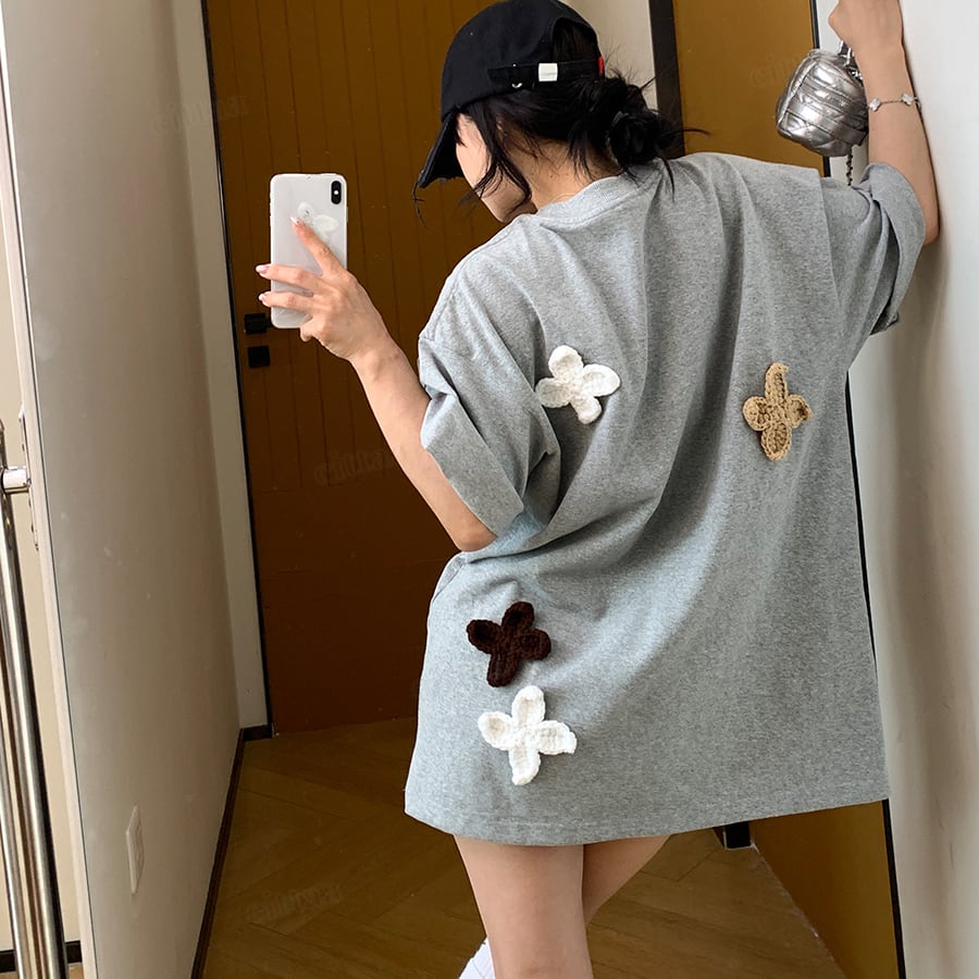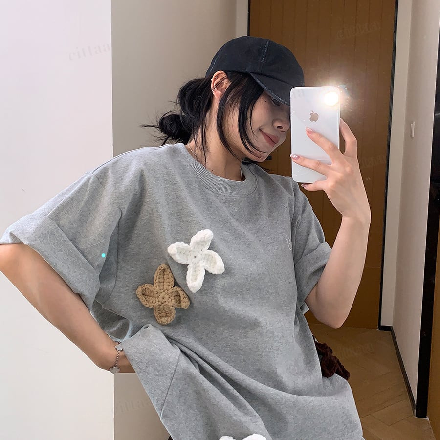 ★予約★D-976 2026春新作♡3Dニット花柄刺繍デザイン半袖Tシャツ グレー