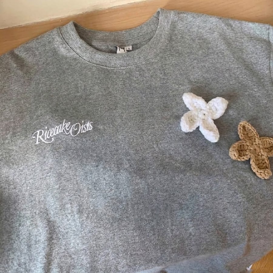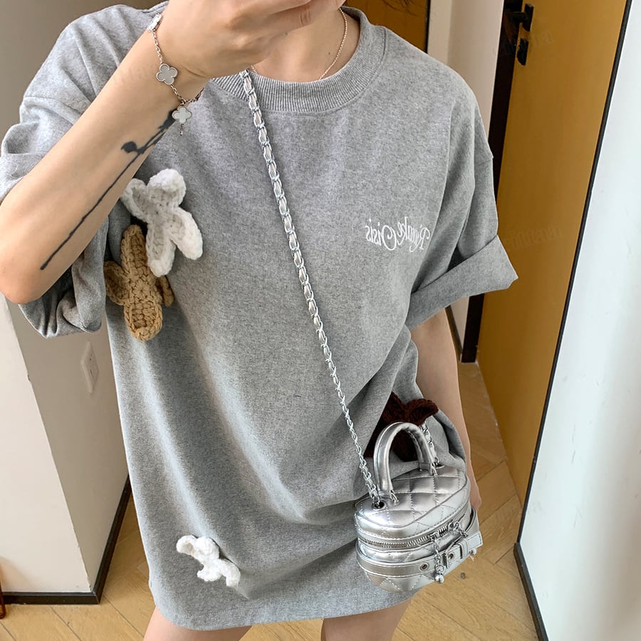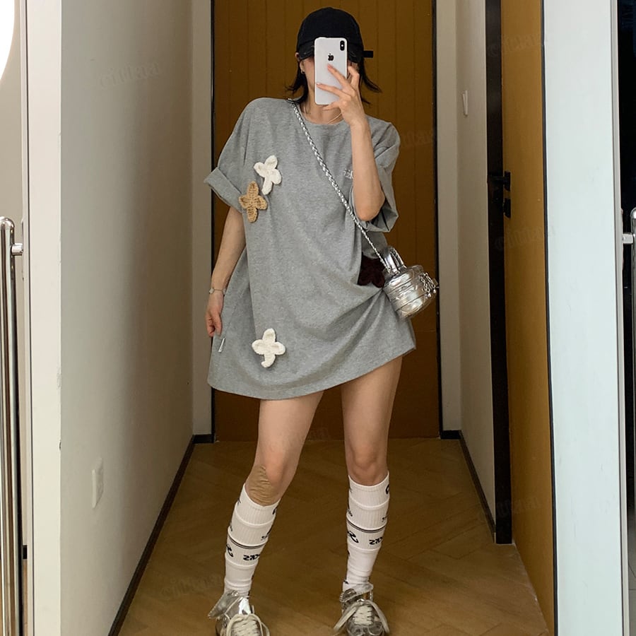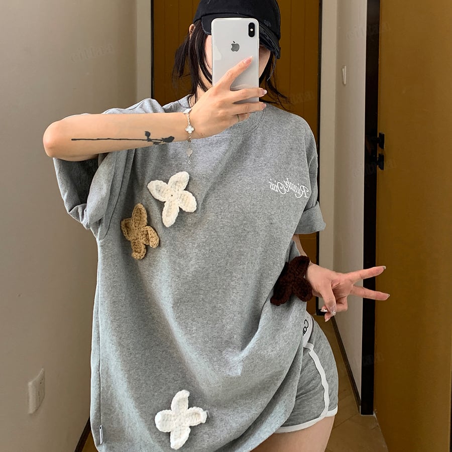 ★予約★D-976 2026春新作♡3Dニット花柄刺繍デザイン半袖Tシャツ グレー