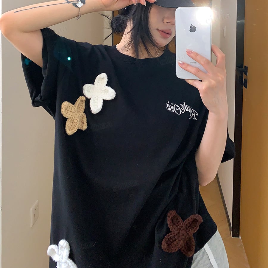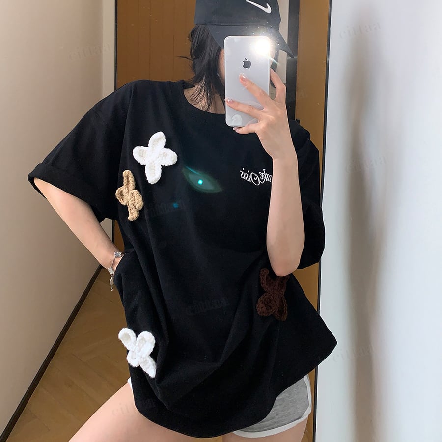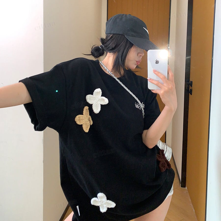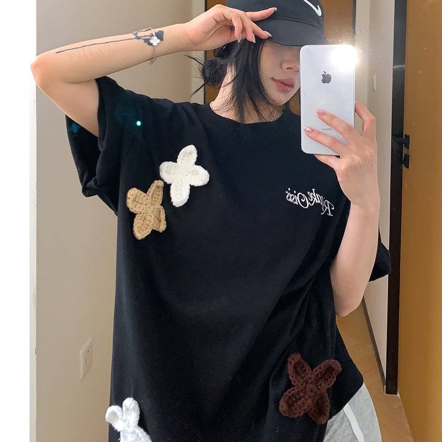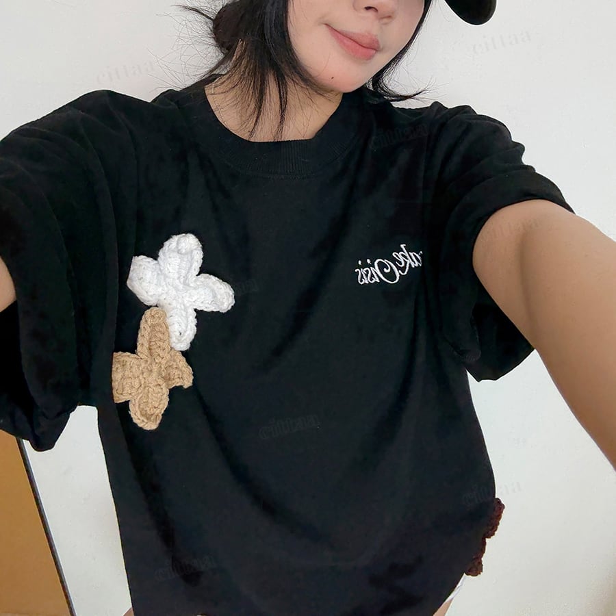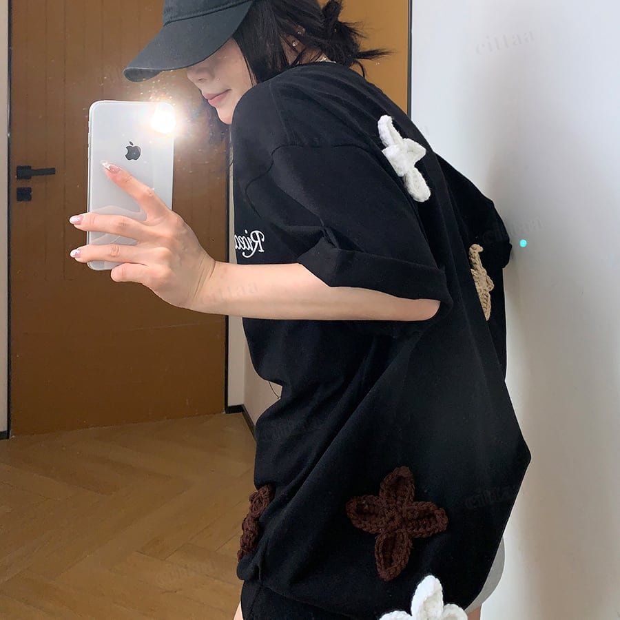★予約★D-976 2026春新作♡3Dニット花柄刺繍デザイン半袖Tシャツ ブラック