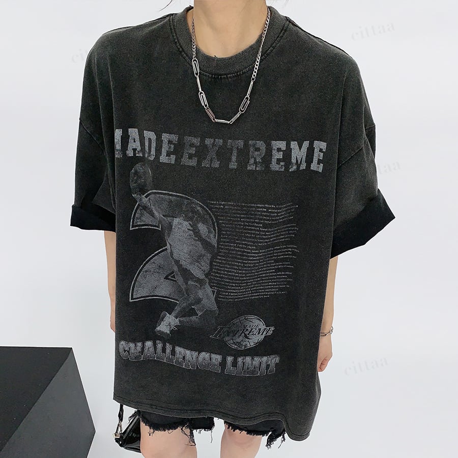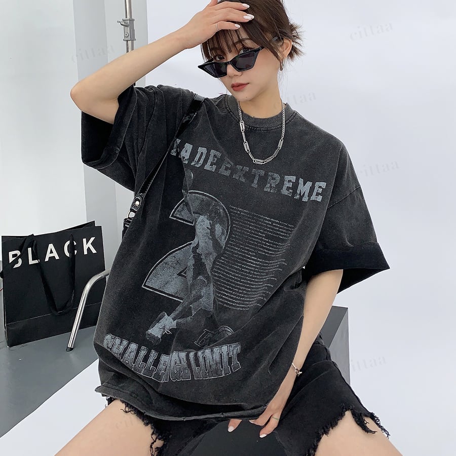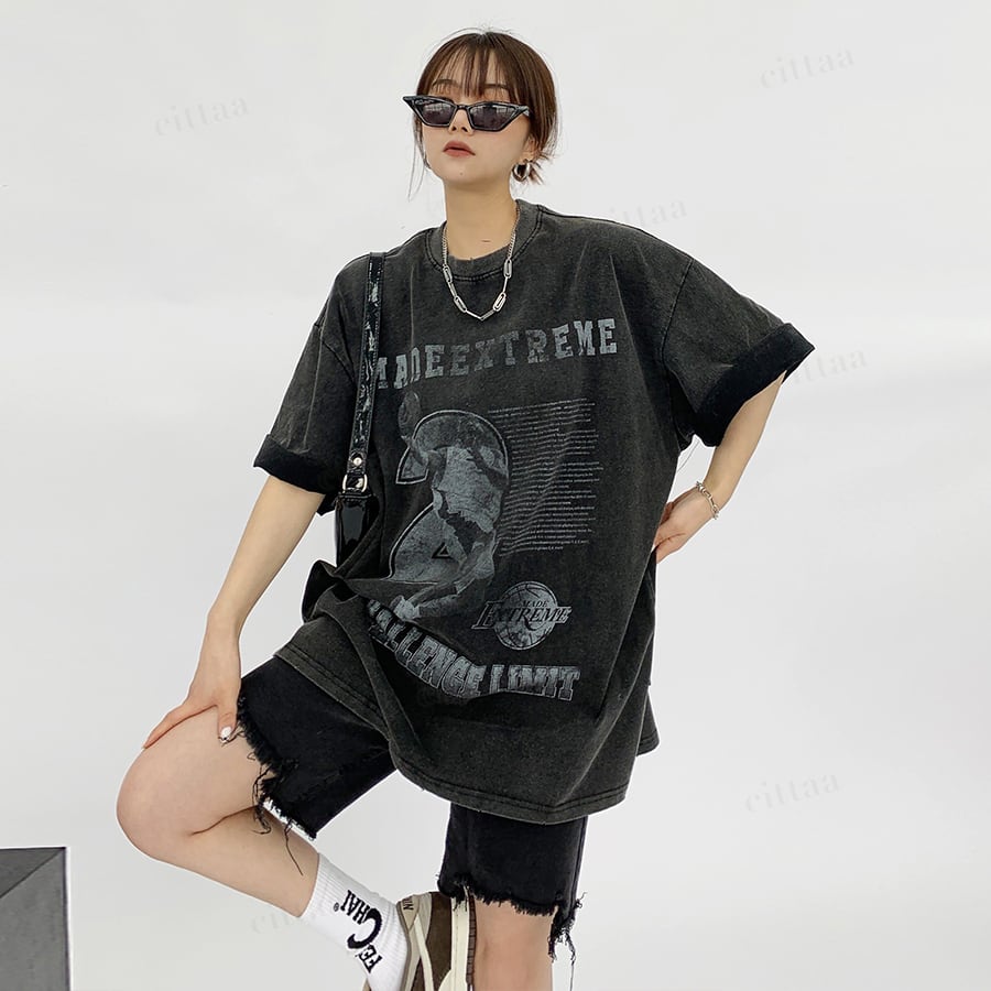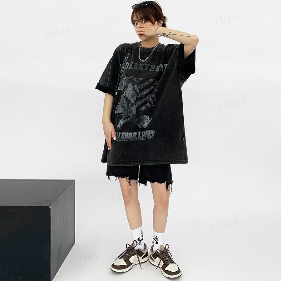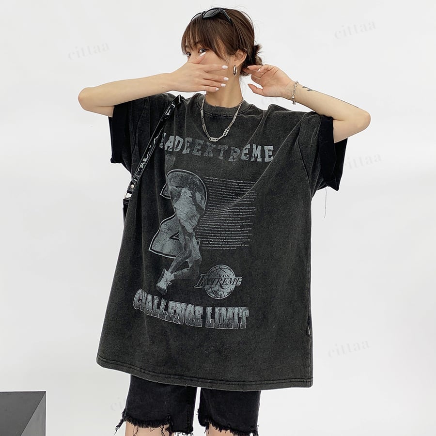 フロントに大きく配置されたバスケットプリントが目を惹くデザイン。スポーティーな雰囲気が今っぽく、コーデのアクセントに。古着のような風合いのかすれプリントと色落ち加工で、こなれ感のあるスタイルが完成します。