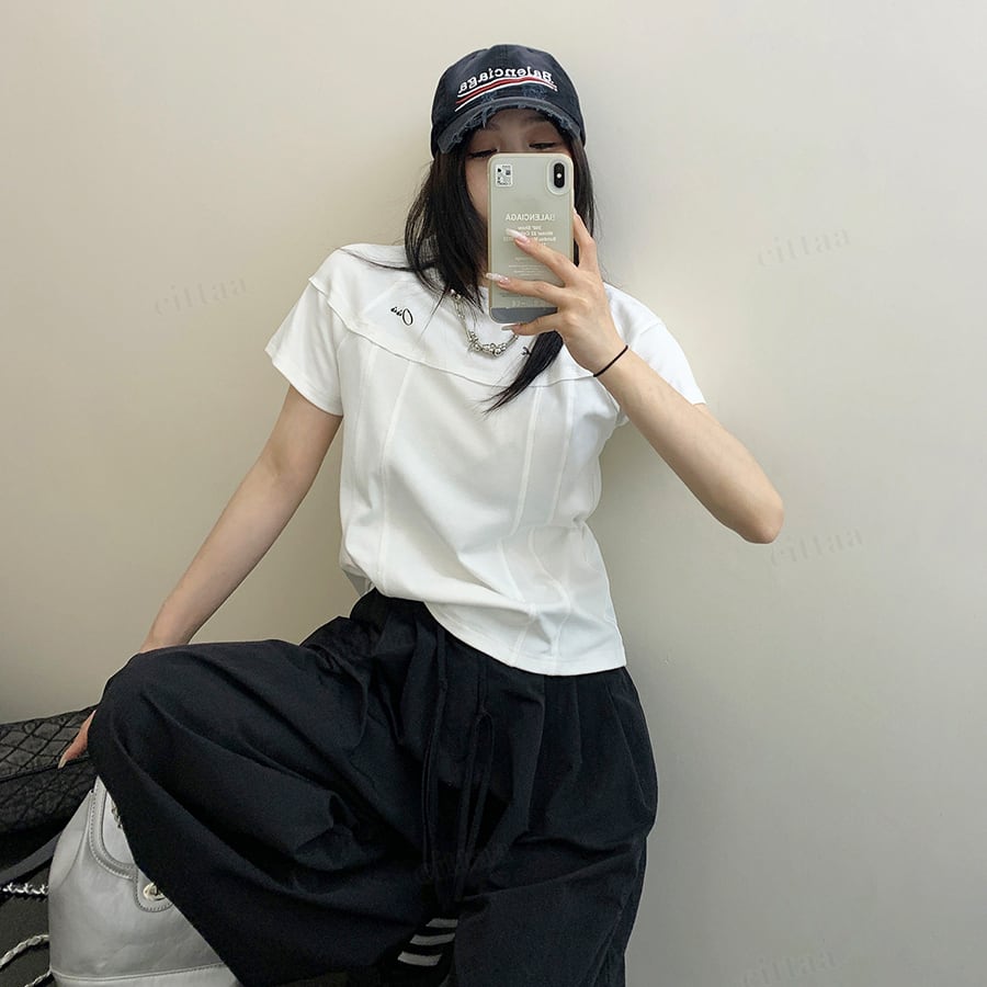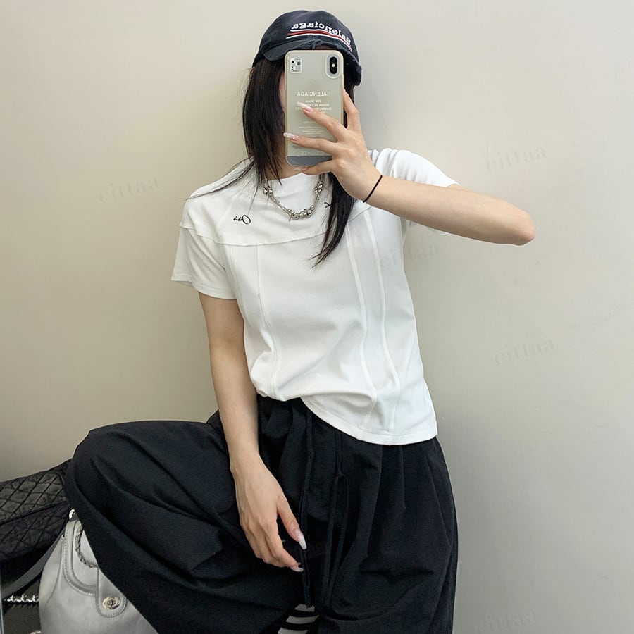 ユニークな切り替えデザインで差がつくショート丈Tシャツ。