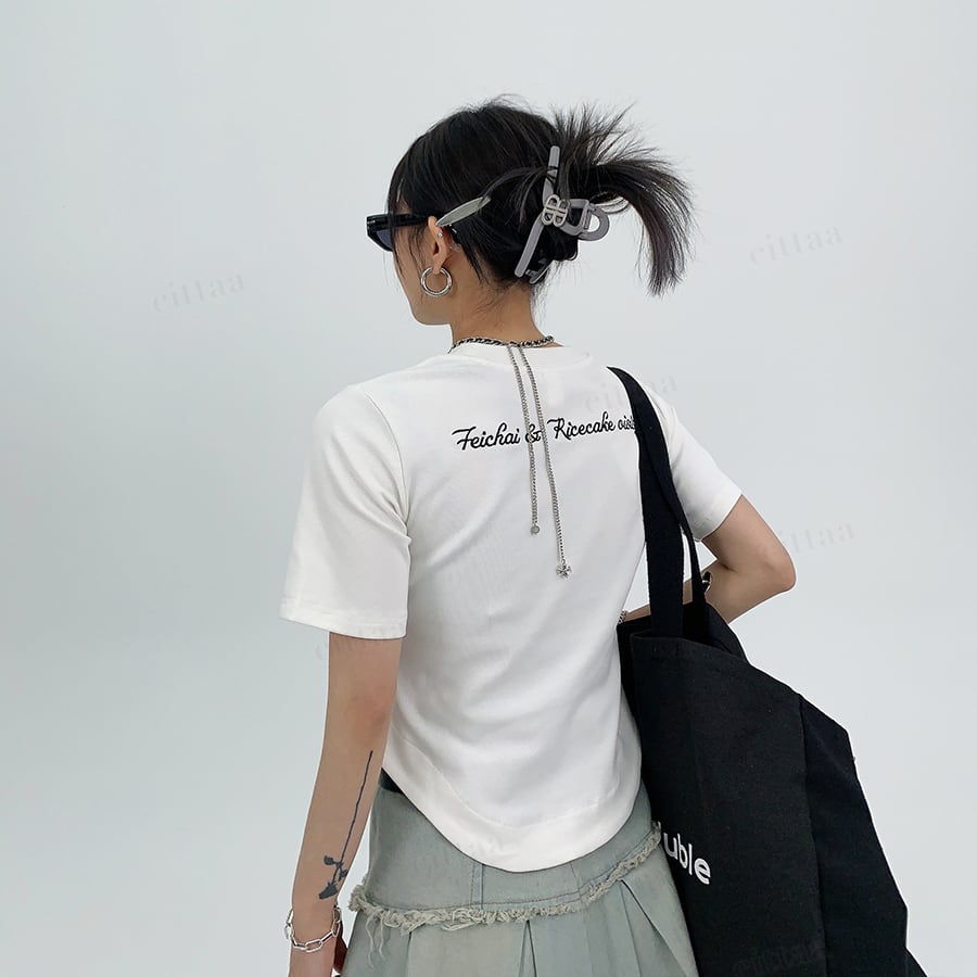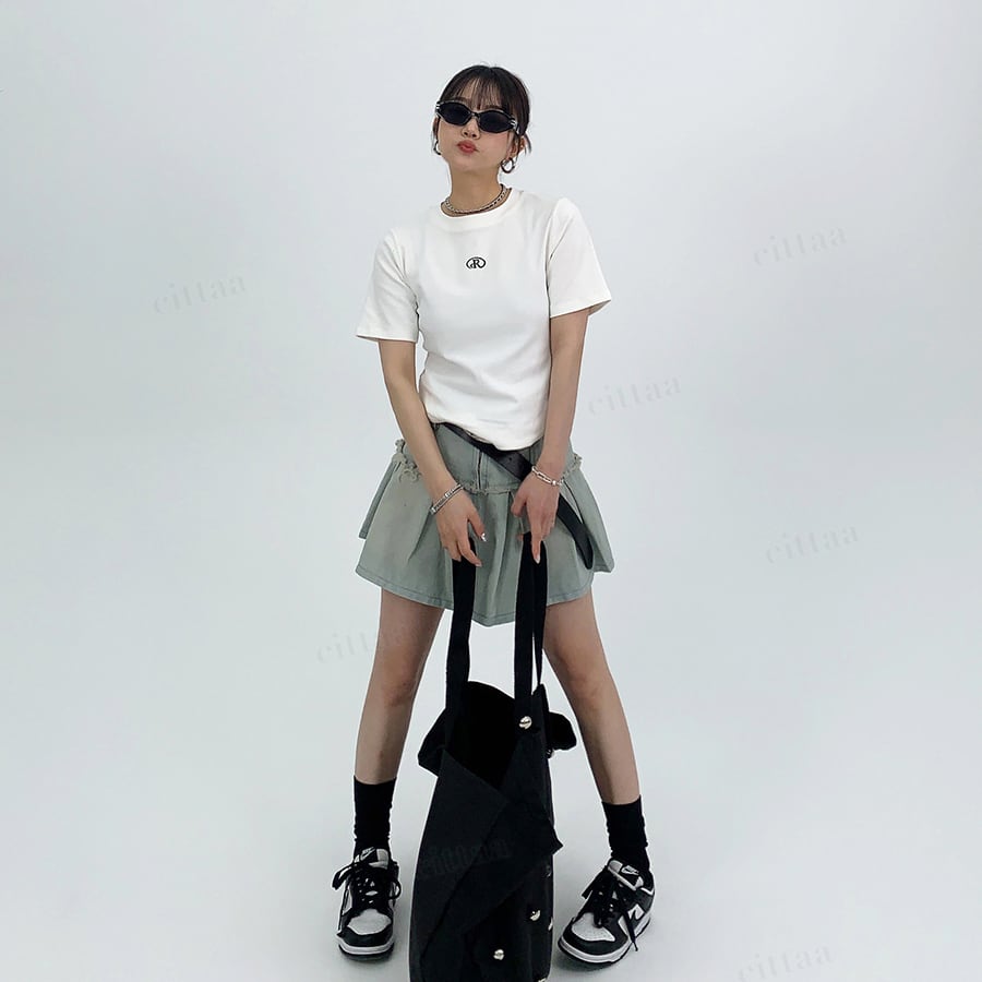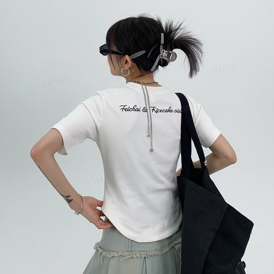 ★予約★D-991 2026春新作♡R刺繍バックロゴラウンドヘムショート丈Tシャツ ホワイト