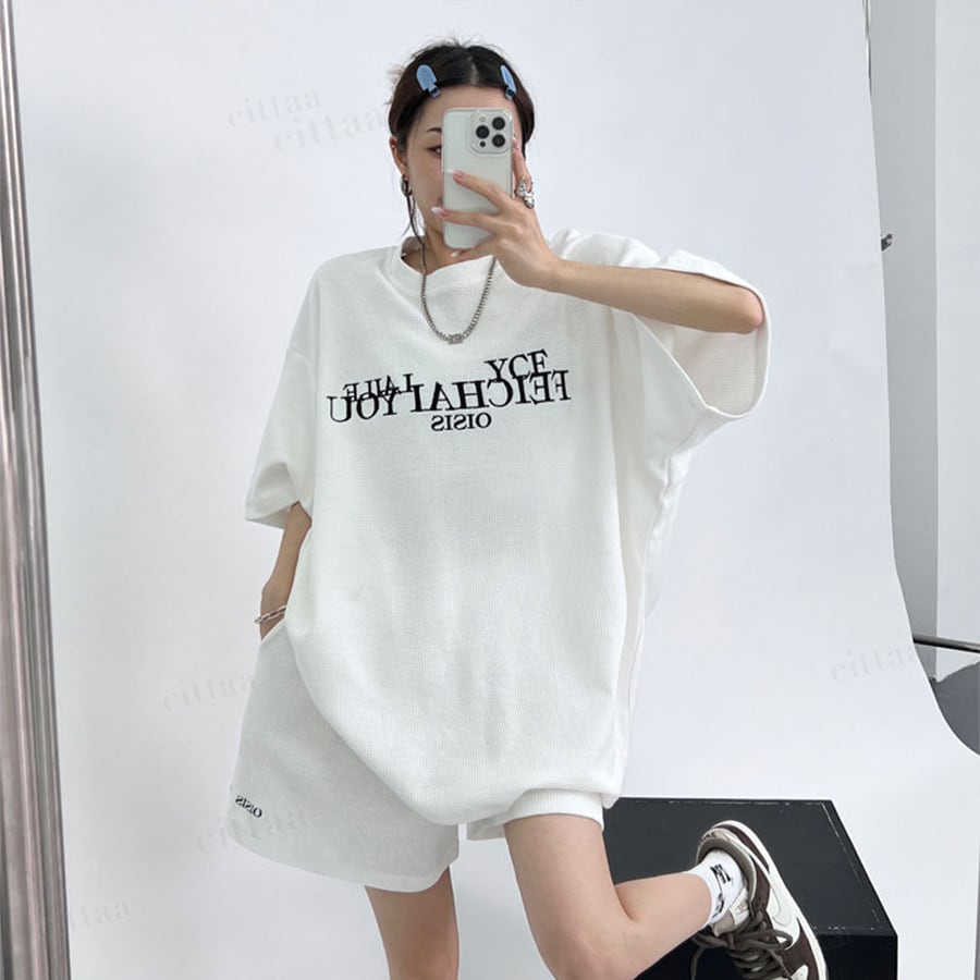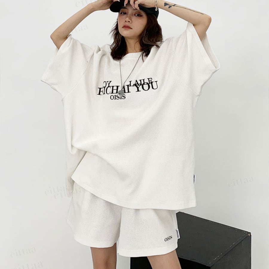 フロントの刺繍ロゴがアクセントに効いた半袖トップス×ショートパンツのセットアップ。高見えデザインで大人っぽいストリートカジュアルが完成。上下そのまま着るだけでコーデが決まります。ワッフル生地で着心地も快適。