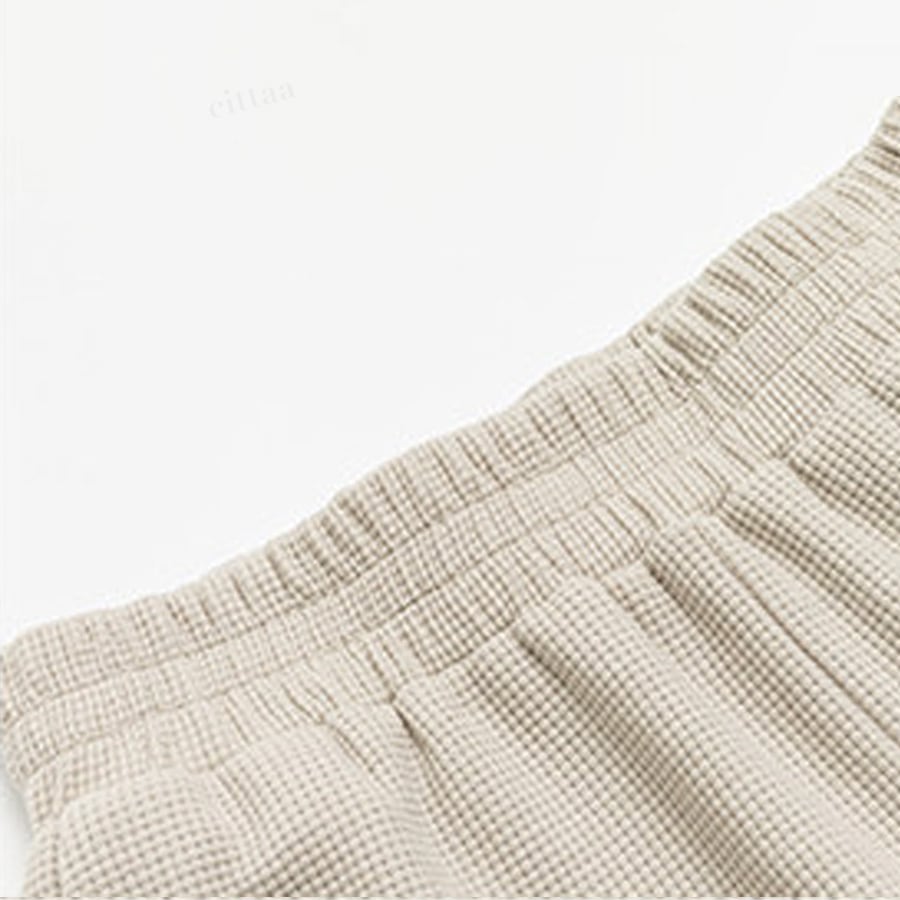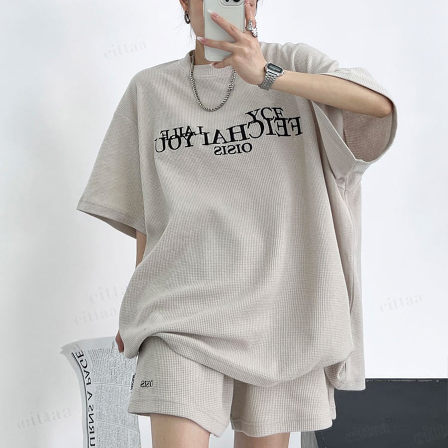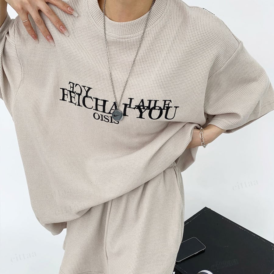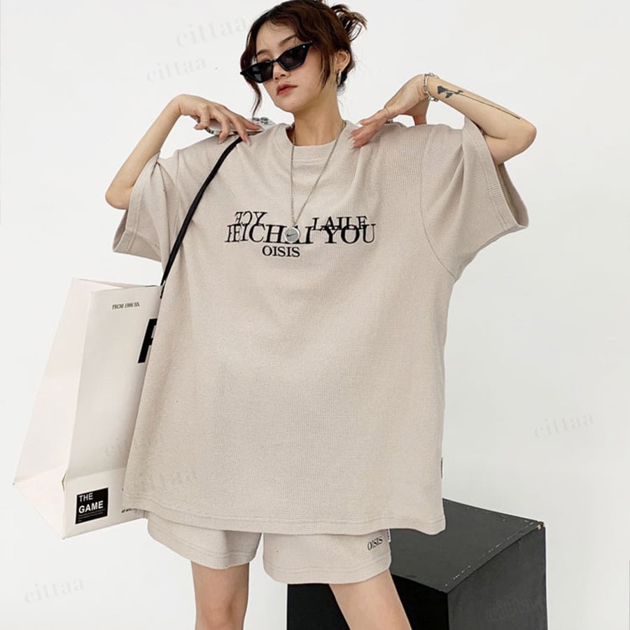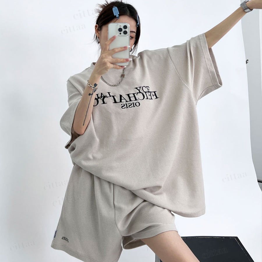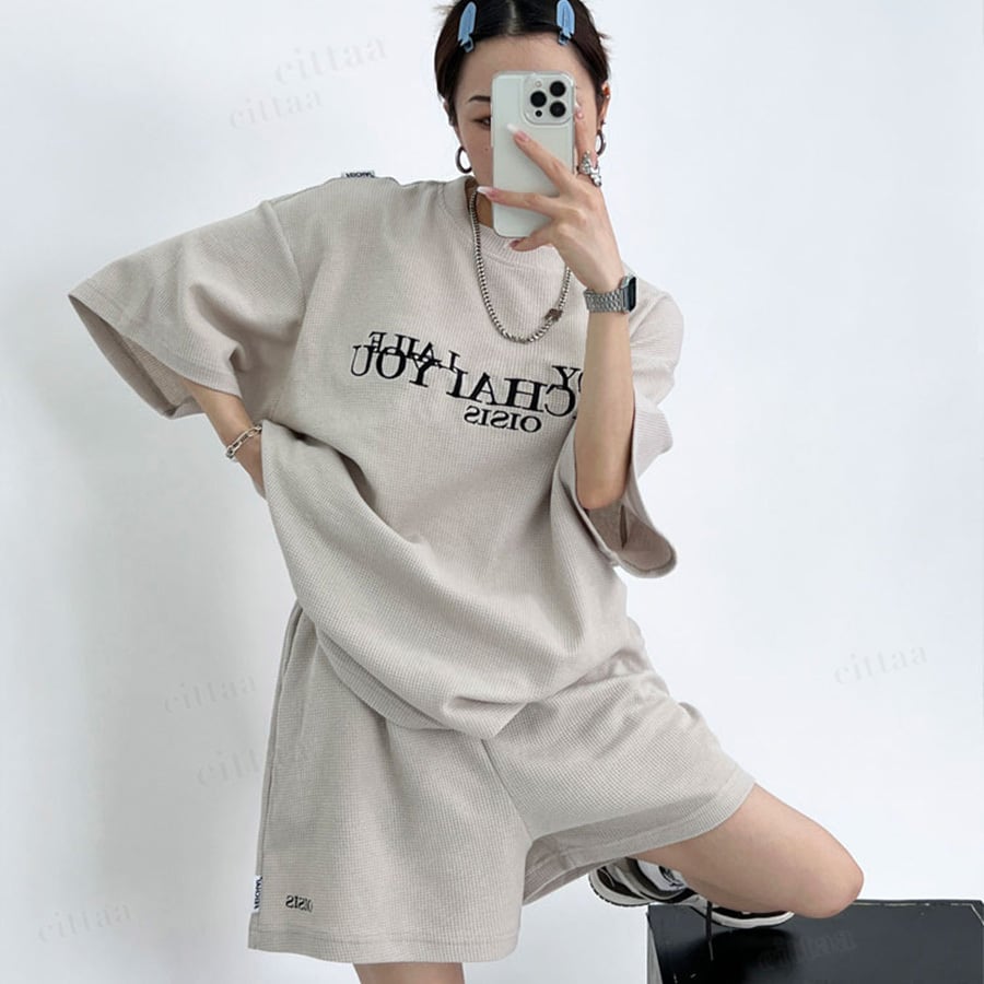 フロントの刺繍ロゴがアクセントに効いた半袖トップス×ショートパンツのセットアップ。高見えデザインで大人っぽいストリートカジュアルが完成。上下そのまま着るだけでコーデが決まります。ワッフル生地で着心地も快適。