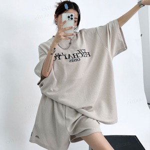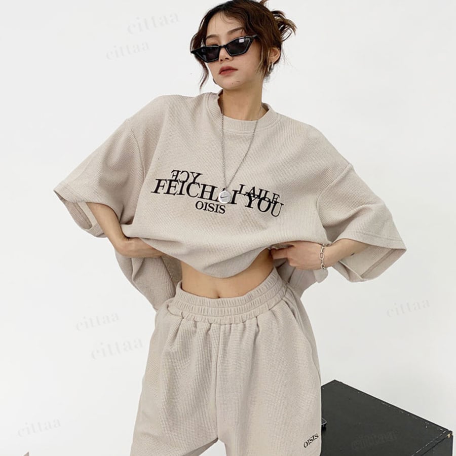 ★予約★D-1007 2026春新作♡【上下セット】FEICHAI刺繍ロゴワッフル半袖セットアップ ベージュ