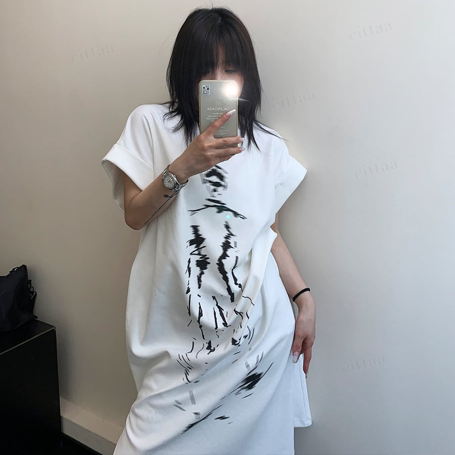 ★予約★D-1008 2026春新作♡Phantomプリントフレンチスリーブロング丈ワンピース ホワイト