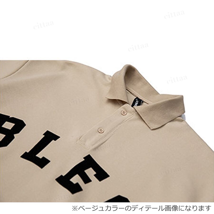 フロントに大きく配置された英字ロゴが目を引くデザイン。辛口なロゴデザインがストリートな雰囲気を演出し、着るだけで今っぽい着こなしに。襟付きのポロデザインがカジュアルすぎず、大人っぽい印象に仕上げてくれます。