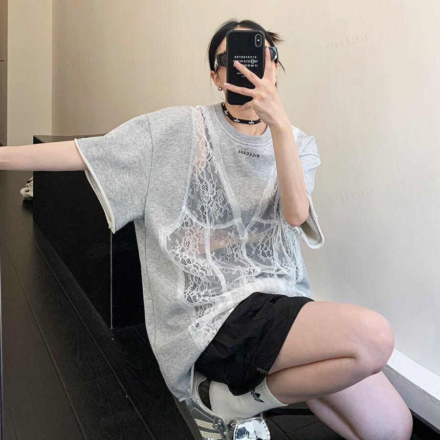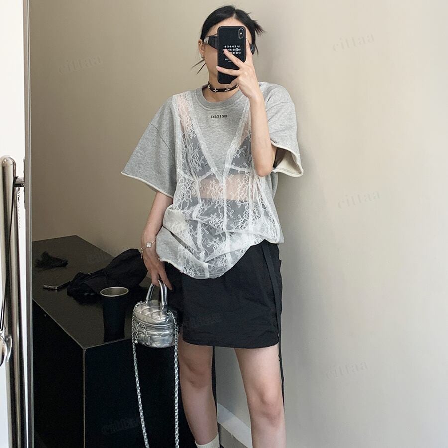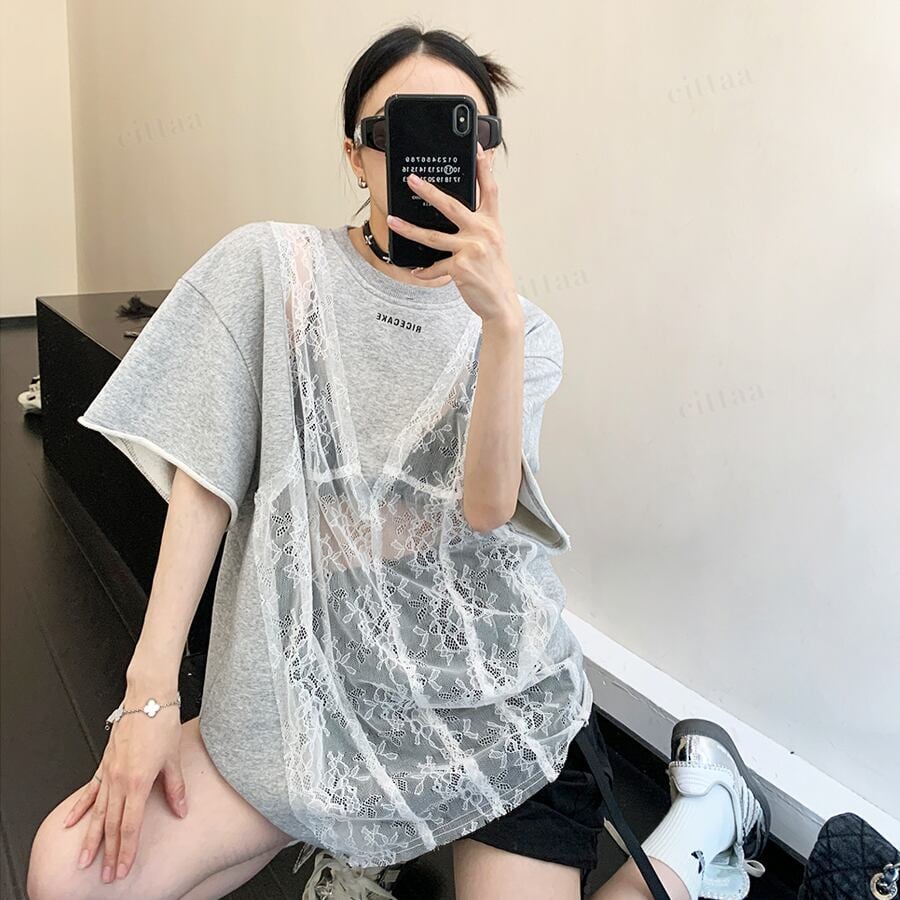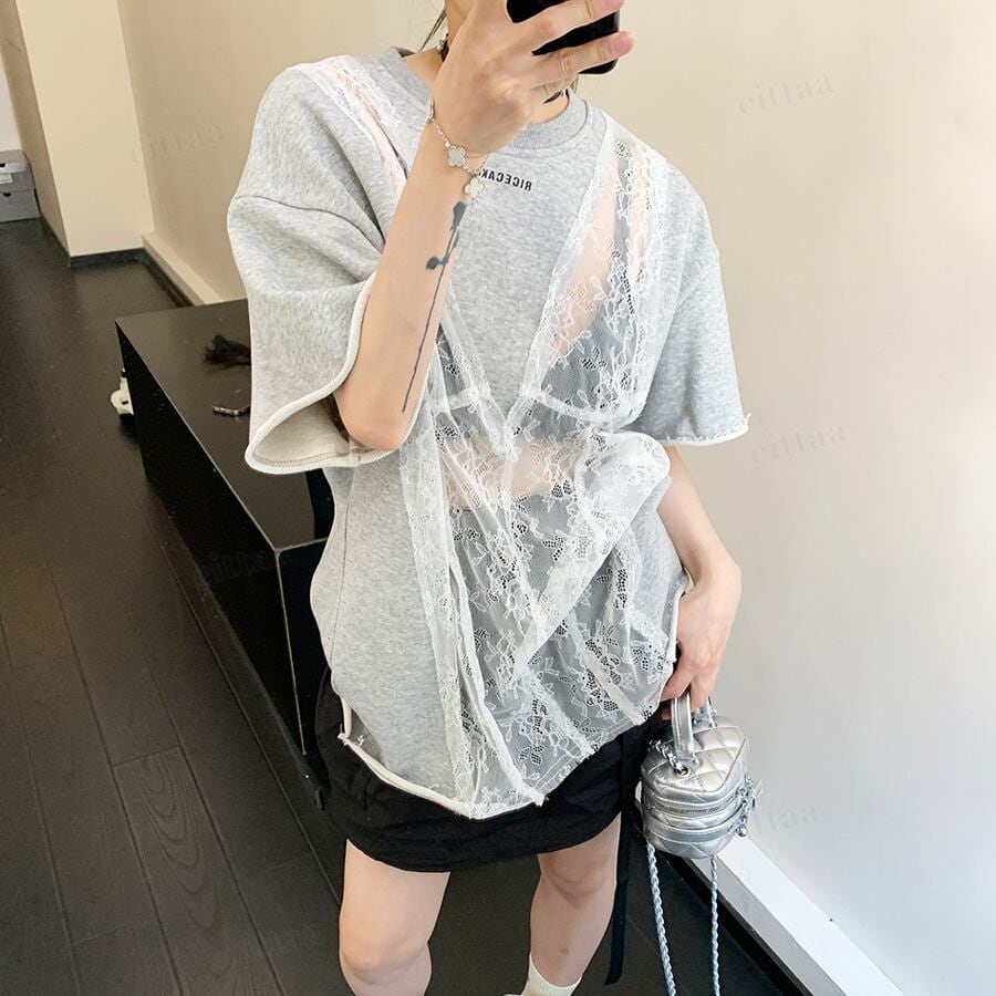 透け感のあるレース素材との切り替えデザインが目を引く一枚。袖と裾は切りっぱなし仕様で、ラフなのに洒落見えする仕上がりに。フロントの控えめなロゴがさりげないアクセントになり、抜け感をプラス。ほどよい肌見せがヘルシーで、大人っぽい着こなしを演出します。※レース部分は透け感があるためインナーの着用をおすすめします。