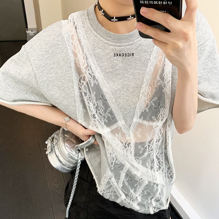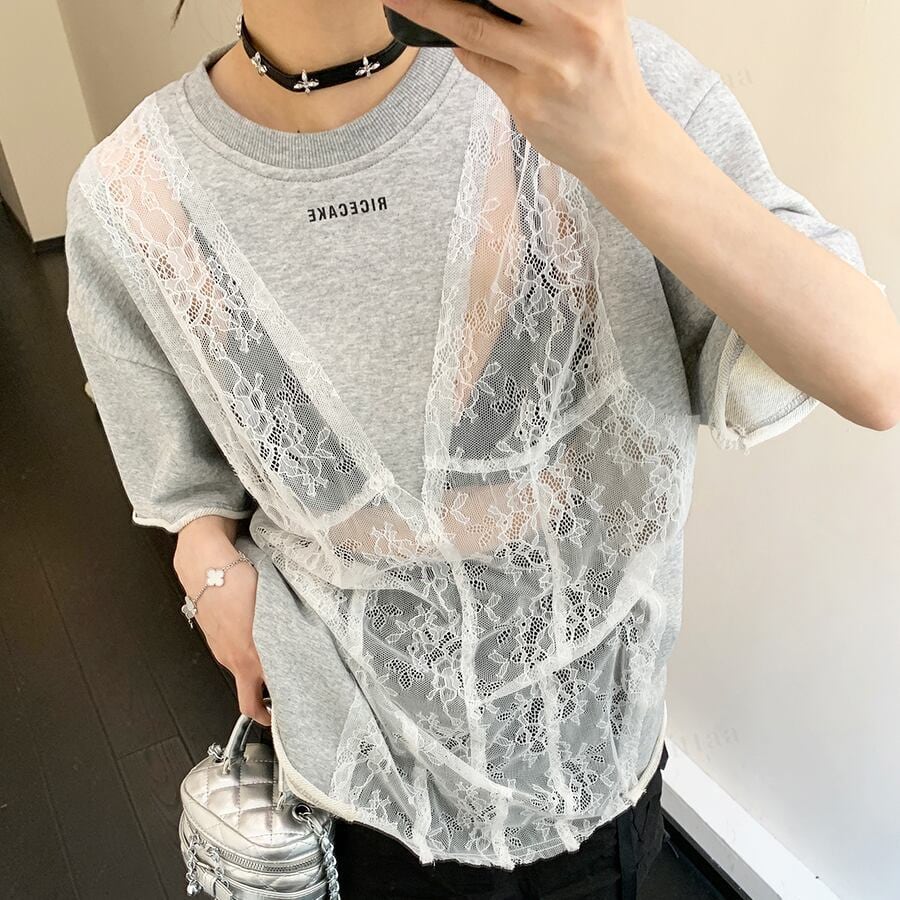 ★予約★D-1013 2026春新作♡RICECAKEレースドッキングダメージ加工半袖トップス グレー