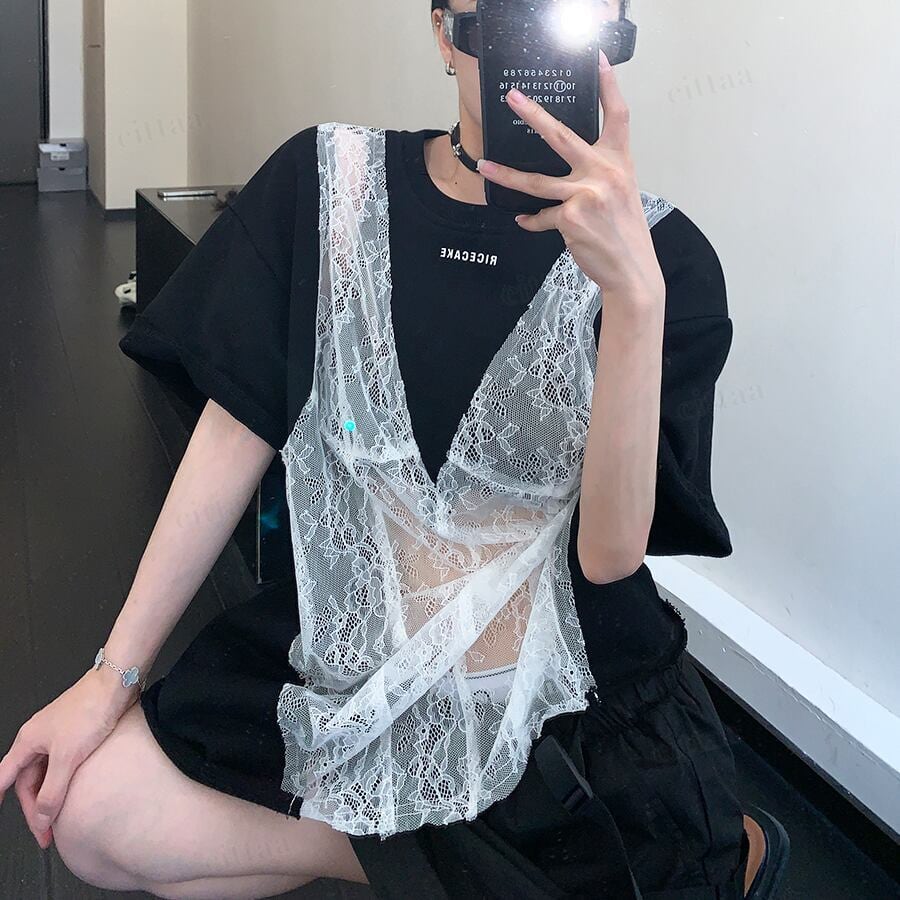 透けレースドッキングデザインがヘルシーで大人っぽい個性派トップス