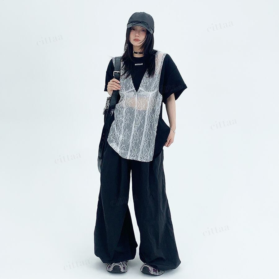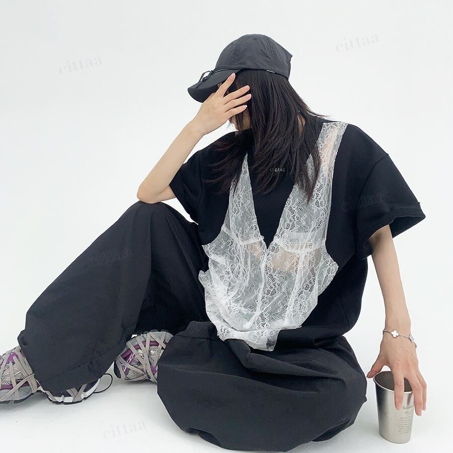 透け感のあるレース素材との切り替えデザインが目を引く一枚。袖と裾は切りっぱなし仕様で、ラフなのに洒落見えする仕上がりに。フロントの控えめなロゴがさりげないアクセントになり、抜け感をプラス。ほどよい肌見せがヘルシーで、大人っぽい着こなしを演出します。※レース部分は透け感があるためインナーの着用をおすすめします。