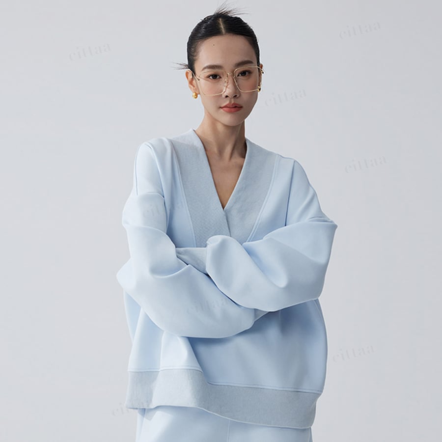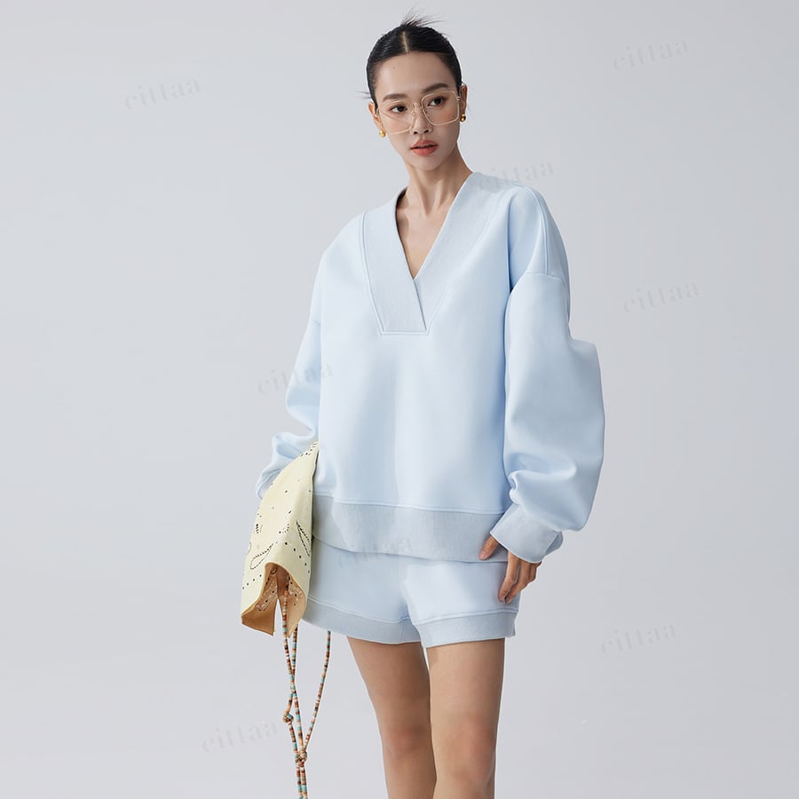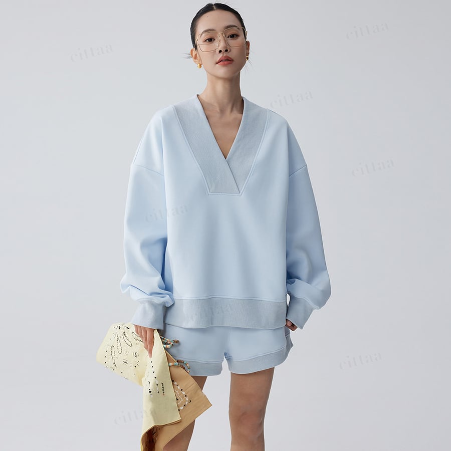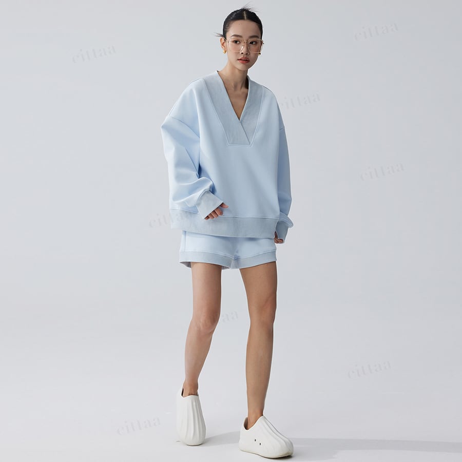 ★予約★D-1033 2026春新作♡【セットアップ可能】深Vネックスウェットプルオーバー ブルー