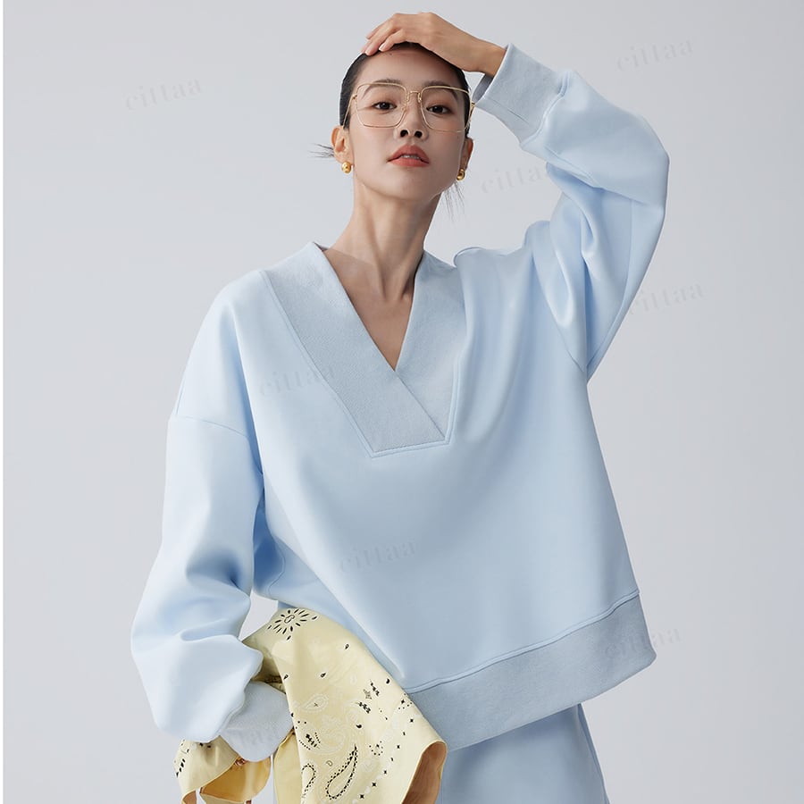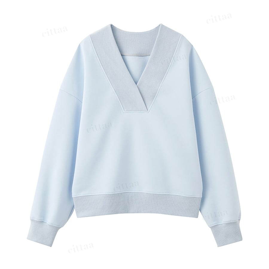 印象的な深めのVネックが抜け感を演出するスウェットプルオーバー。太めのリブデザインがほどよくカジュアルさをプラスし、デイリーに使いやすい一枚に。ハリ感のあるやわらかな素材で、ラフになりすぎずキレイめな印象をキープ。型崩れしにくく、長く愛用できるのも嬉しいポイントです。