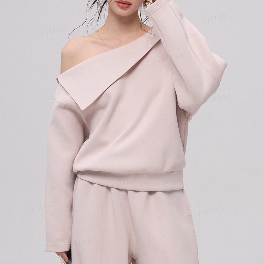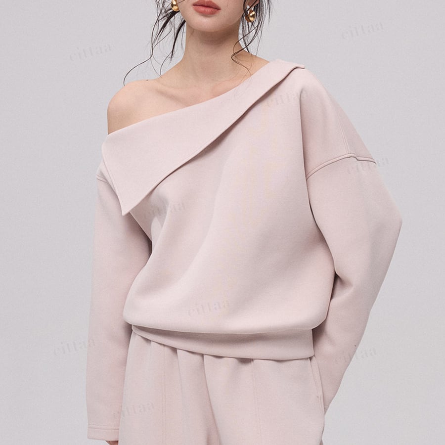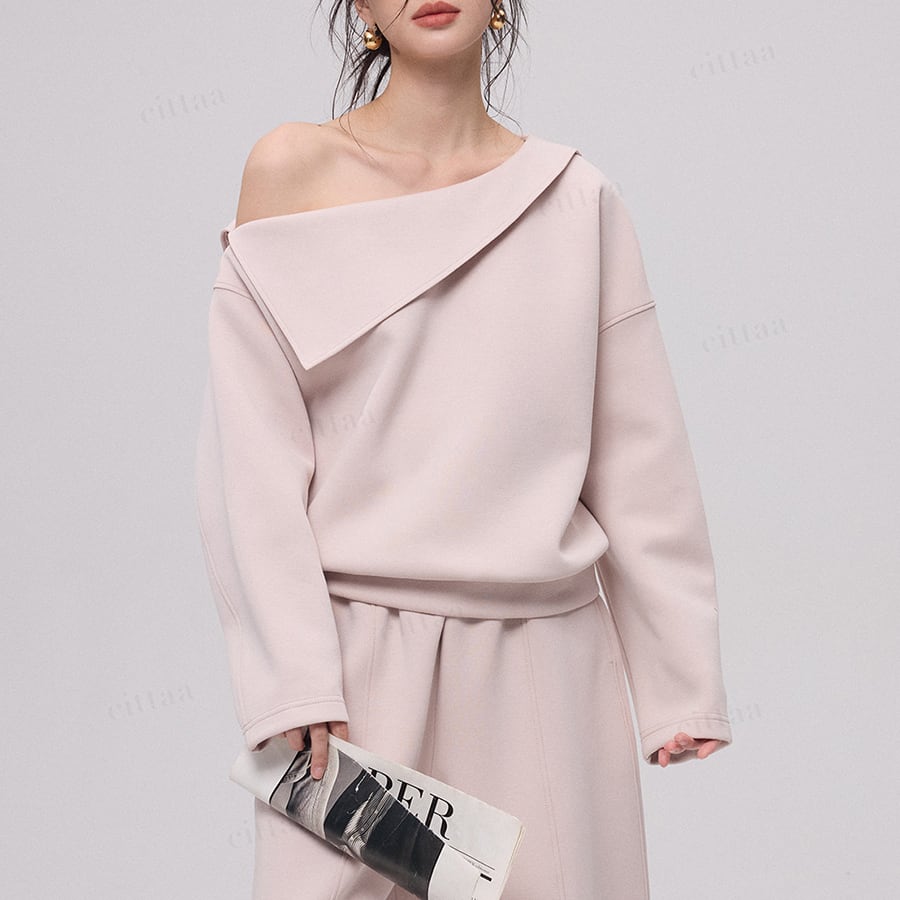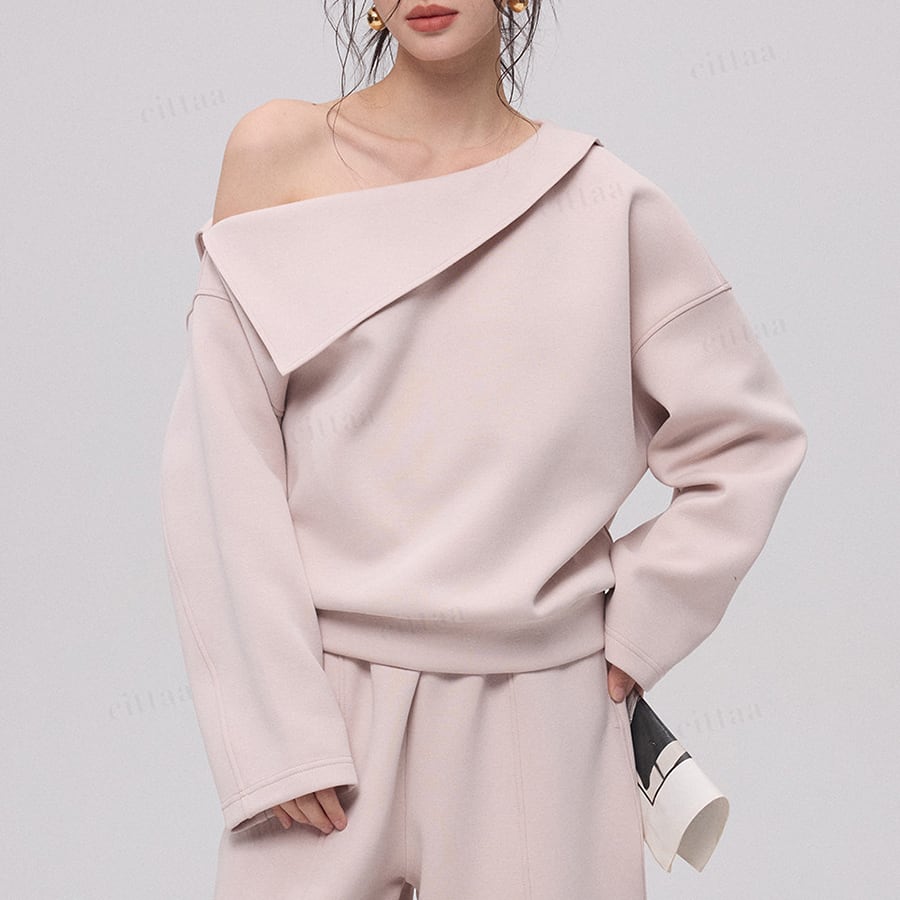 斜めに開いたワンショルダーと折り返しデザインがポイントの一枚。抜け感のある肌見せでヘルシーな女性らしさを演出し、洗練されたスタイリッシュな印象に仕上がります。ハリ感のあるやわらかな生地を使用し、カジュアルになりがちなスウェットもラフすぎずキレイめな雰囲気に。型崩れしにくく、長く愛用できるのも嬉しいポイントです。