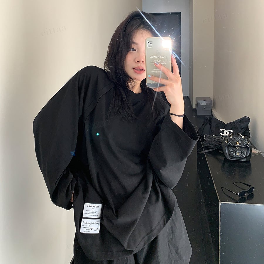 ★予約★D-1016 2026春新作♡ラグラン切り替えラベル付き薄手長袖Tシャツ ブラック