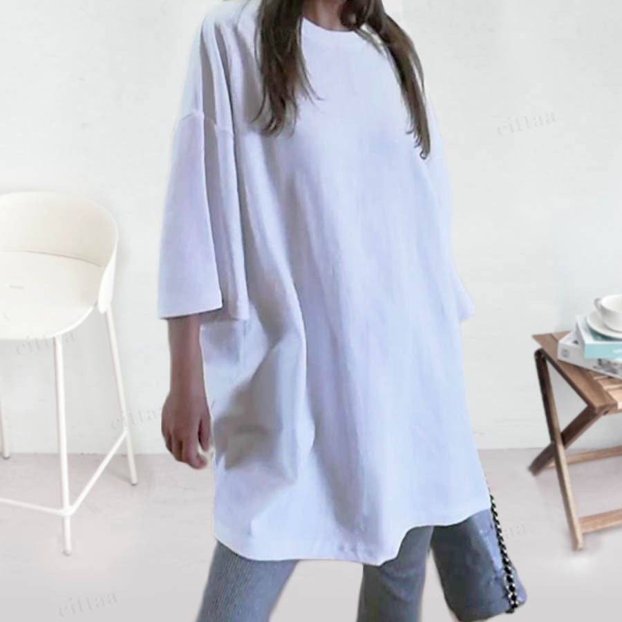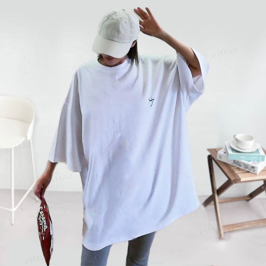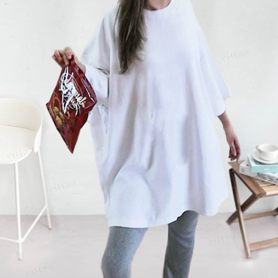 ゆるっとラフに着られるオーバーサイズで今っぽいシルエットに。ヒップがしっかり隠れる着丈で体型カバーも叶えてくれます。レギンス合わせやミニワンピ風の着こなしもおすすめ。長めの袖丈で気になる二の腕もさりげなくカバー。厚手のコットン素材でしっかり高見えします。