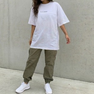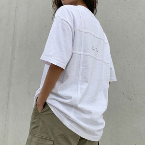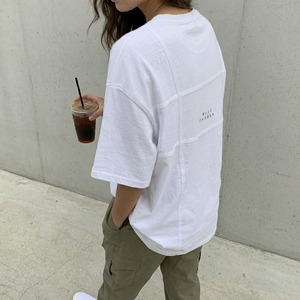 フロントとバックにあしらわれたテープデザインがポイントのTシャツ。ボディと同色のテープで主張しすぎず、さりげなく差がつくお洒落なデザインです。控えめな英字ロゴもアクセントになり、モノトーン配色で大人モードな着こなしに。どの角度から見ても洒落感のある一枚です。