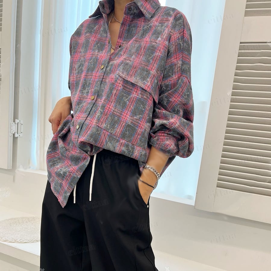 【即納】Y-4845 2026春新作♡ウォッシングデザインオーバーサイズチェックシャツ ピンク 0327