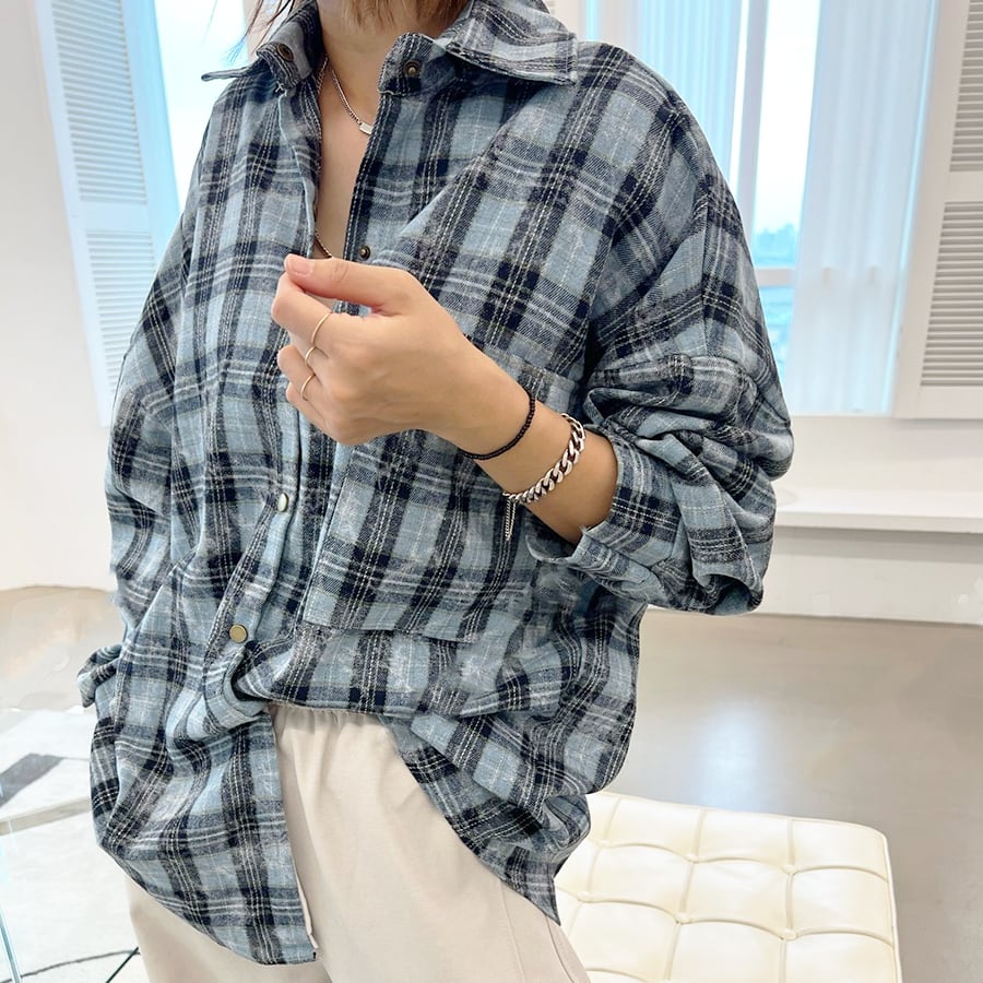 【即納】Y-4845 2026春新作♡ウォッシングデザインオーバーサイズチェックシャツ ブルー 0403