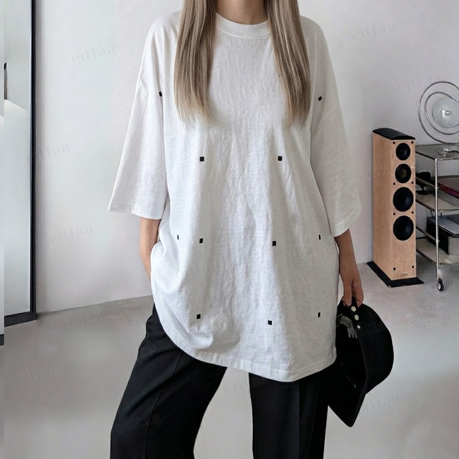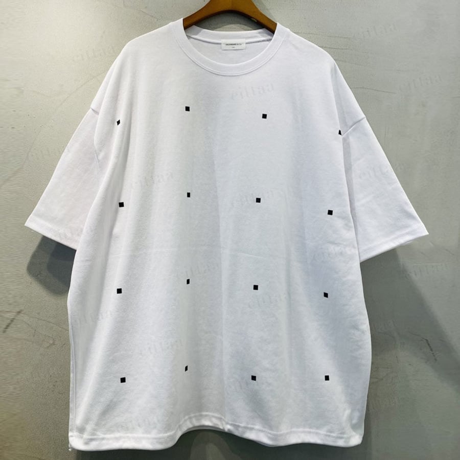 フロントとバックそれぞれに施されたデザインで、どの角度から見てもお洒落に決まる1枚。個性のあるプリントながら、モノトーン配色で大人カジュアルにも取り入れやすいのがポイントです。
