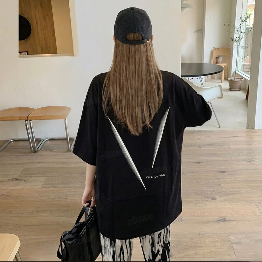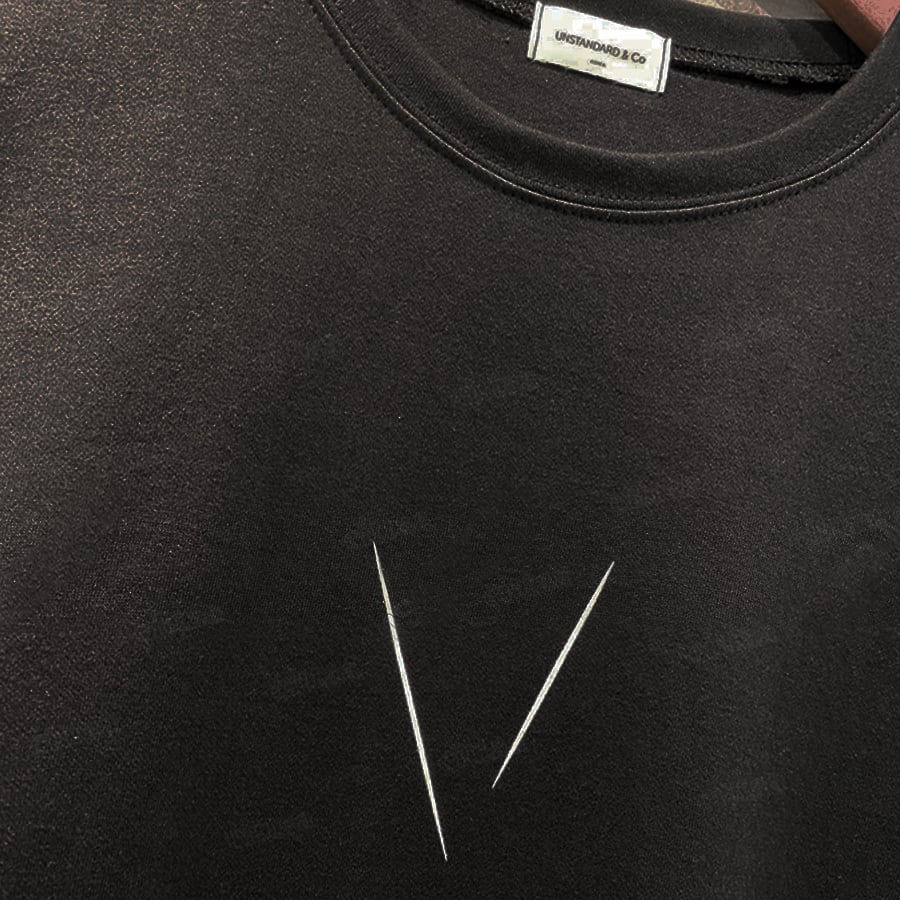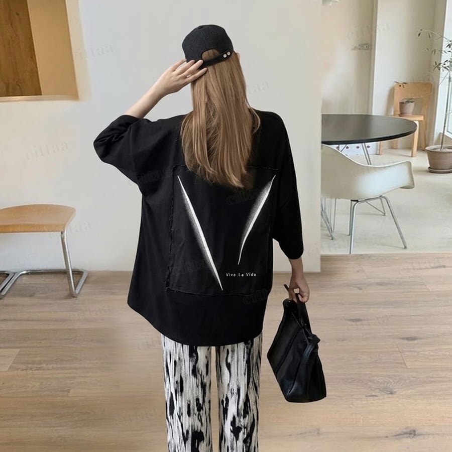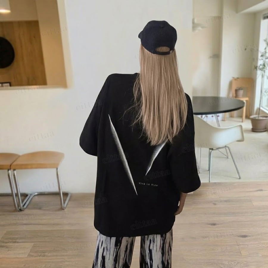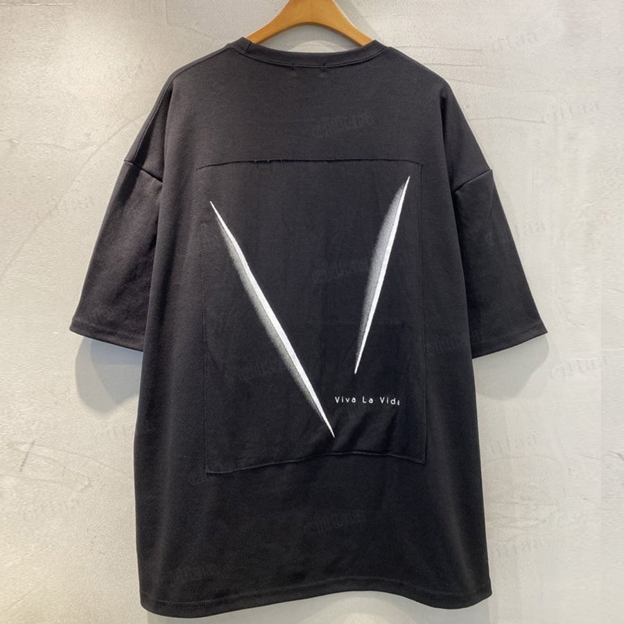 フロントはミニマルなVプリントでさりげなく、バックには大胆なVパッチを配置したメリハリのあるデザイン。さらに「Viva La Vida」のメッセージがアクセントとなり、アート感のある仕上がりに。モノトーンでまとめることで主張しすぎず、大人でも取り入れやすいカジュアルスタイルに。1枚でしっかり着映えします。