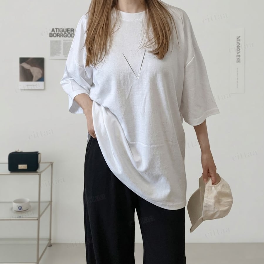 身体のラインを拾わないゆったりシルエットで、自然に体型カバー。長めの袖丈が二の腕をさりげなく隠し、抜け感のあるバランスに。ラフさの中にも大人っぽさを感じるシルエットです。