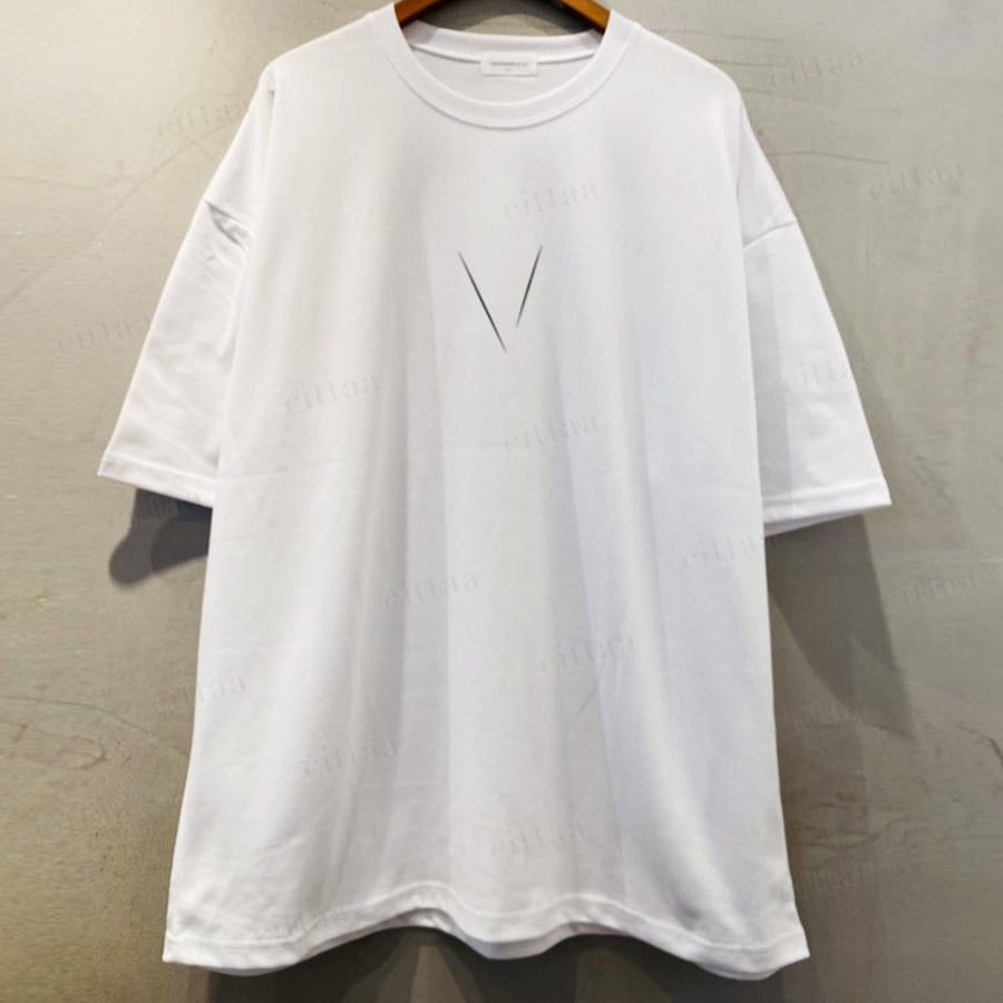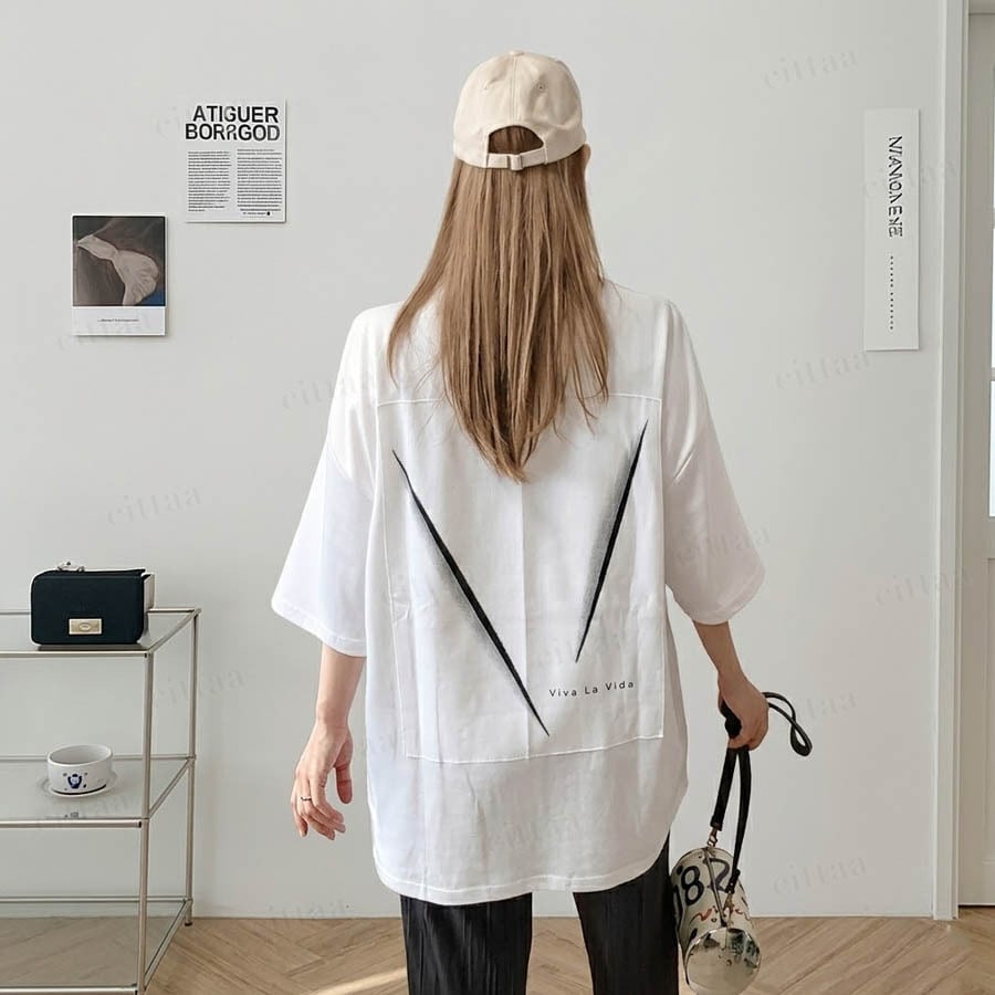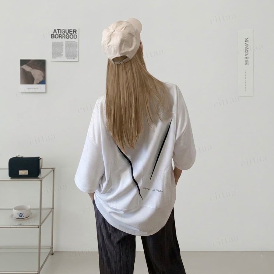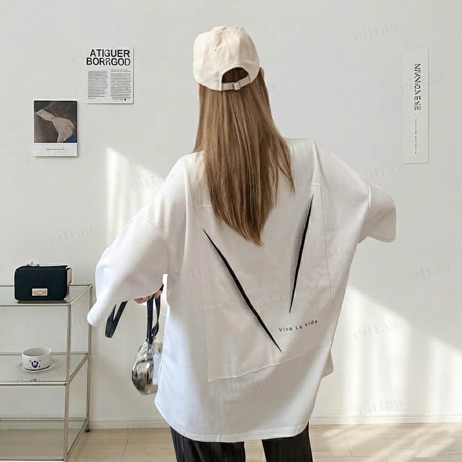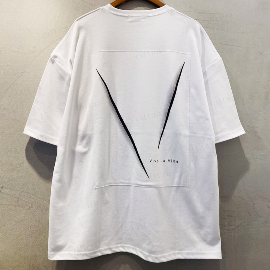 フロントはミニマルなVプリントでさりげなく、バックには大胆なVパッチを配置したメリハリのあるデザイン。さらに「Viva La Vida」のメッセージがアクセントとなり、アート感のある仕上がりに。モノトーンでまとめることで主張しすぎず、大人でも取り入れやすいカジュアルスタイルに。1枚でしっかり着映えします。