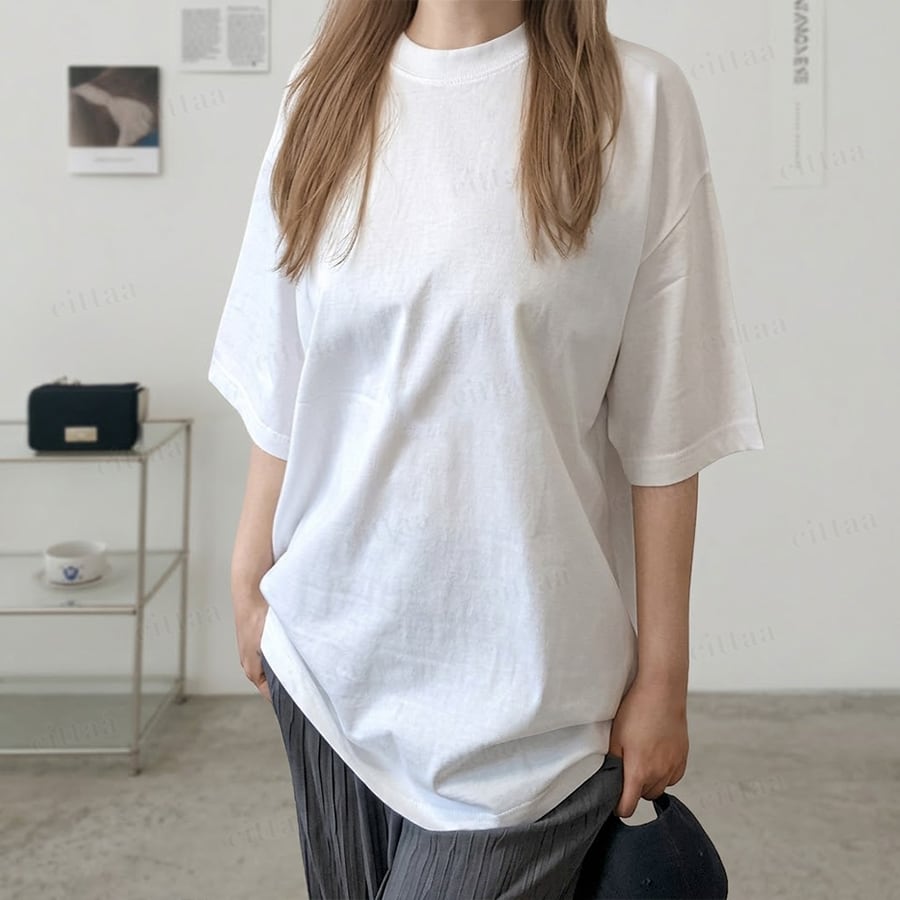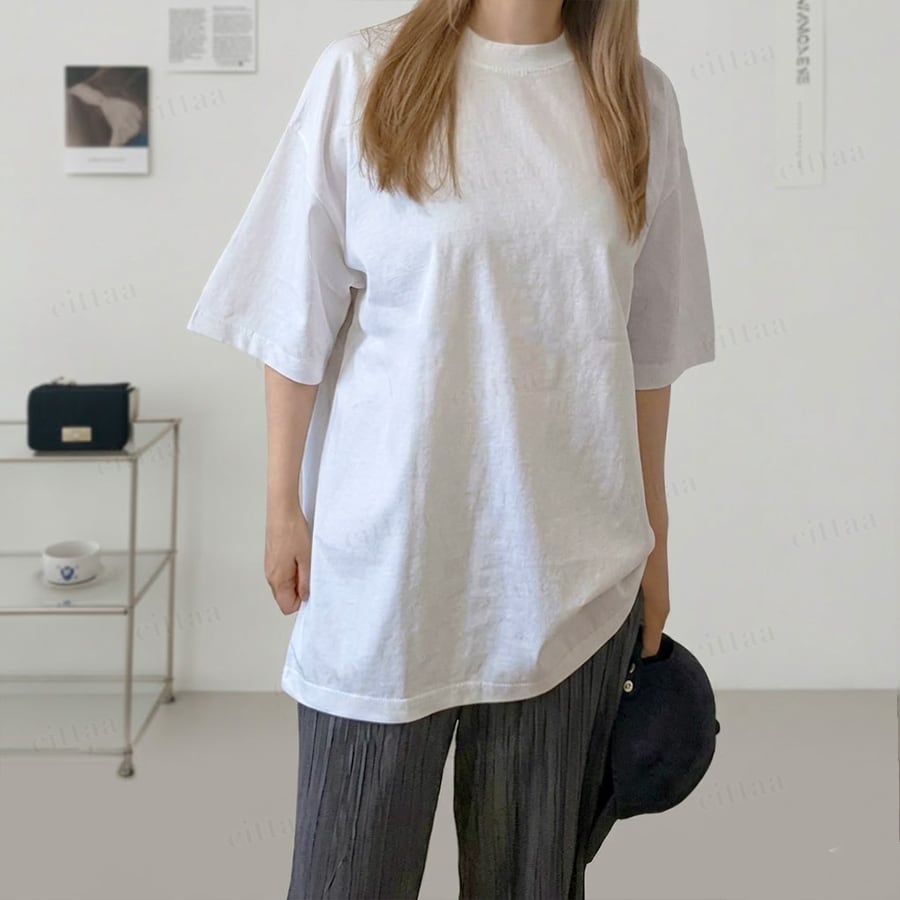 身体のラインを拾わないゆったりシルエットで、自然に体型カバー。さらっと着るだけで抜け感のある着こなしが完成し、リラクシーな着心地も魅力。ラフさの中にも大人っぽさを感じるバランスです。