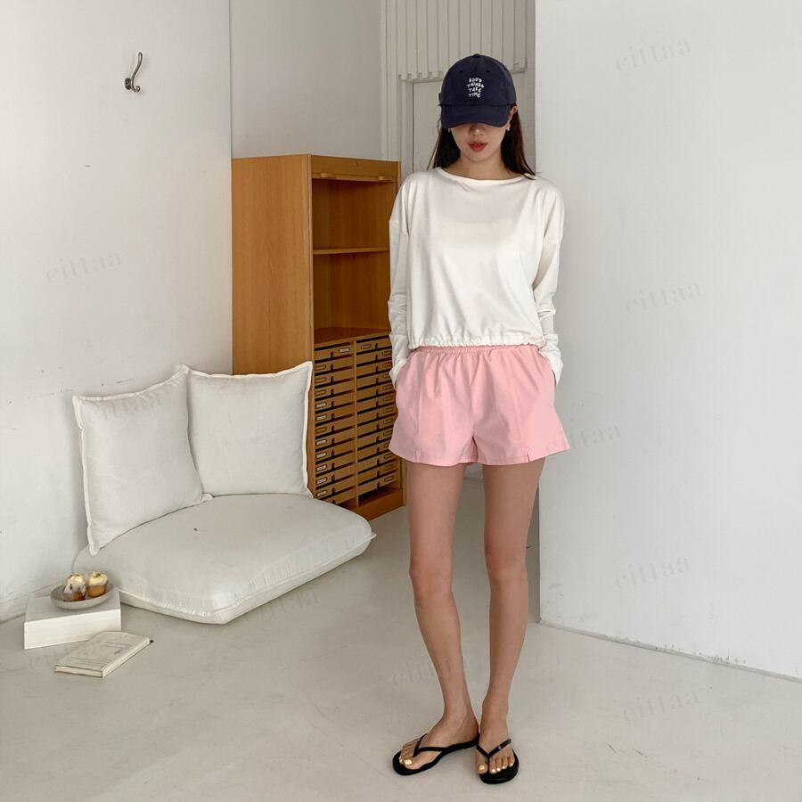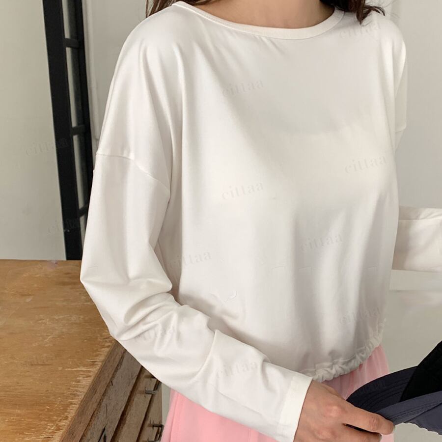 身体のラインを拾わないゆとりのあるシルエットで、自然に体型カバー。裾のシャーリングデザインが丸みのあるフォルムを作り、柔らかい印象に仕上げます。ややコンパクトな着丈でバランスが取りやすく、すっきりと着こなせるのもポイント。