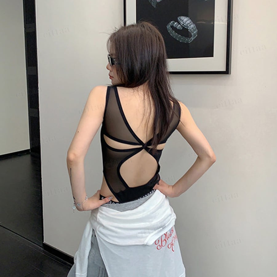 背中部分はメッシュ素材で通気性がよく、快適な着心地。パッド付きでインナーに悩まず着用できるのも嬉しいポイント。見た目だけでなく、着やすさにもこだわったデザインです。
