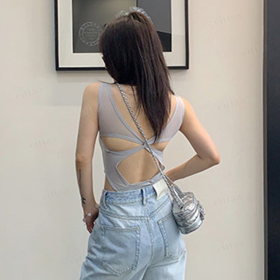 背中部分はメッシュ素材で通気性がよく、快適な着心地。パッド付きでインナーに悩まず着用できるのも嬉しいポイント。見た目だけでなく、着やすさにもこだわったデザインです。