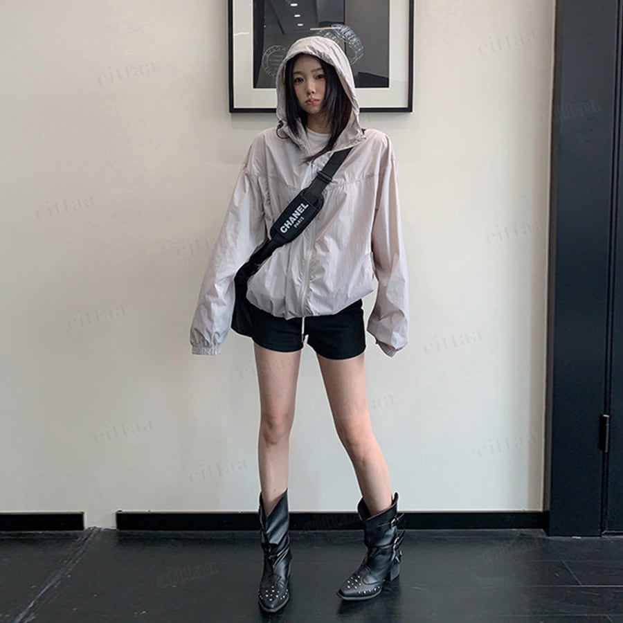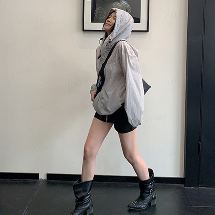 軽やかな薄手素材で、さっと羽織るだけでスタイルが整う1枚。ジップアップ仕様で着脱しやすく、フード付きで頭まわりまでしっかりカバー。シンプルな無地デザインでカジュアルすぎず、大人のデイリーコーデにも馴染みます。